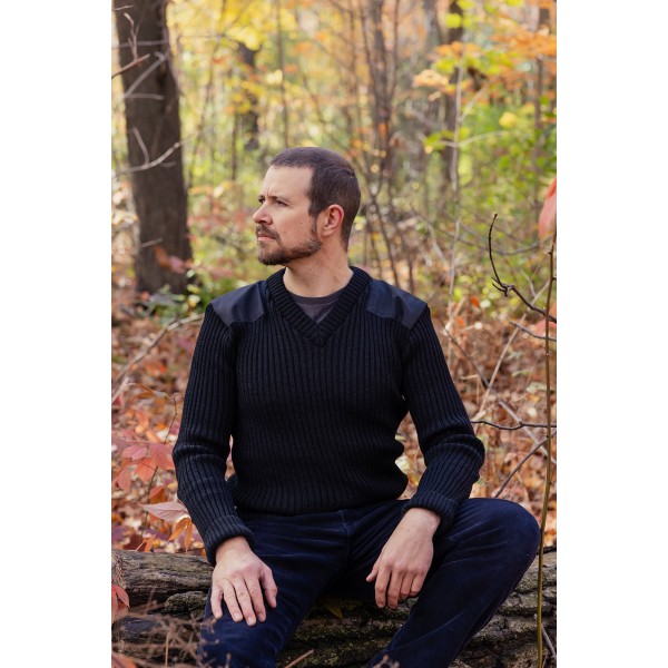 This heavy wool, rib knit crew neck sweater is hardwearing and functional, complete with shoulder patches and elbow patches. Durable and hardwearing, this classic crew neck sweater retains its appearance and shape wash after wash.