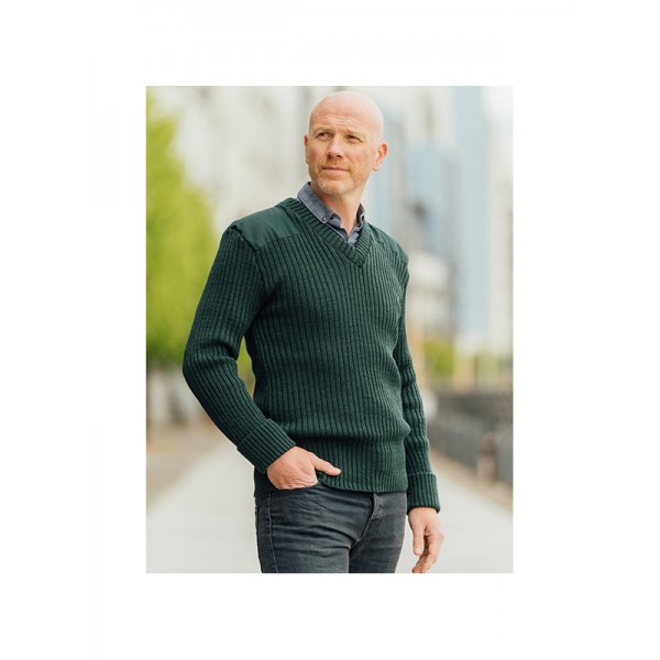 This heavy wool, rib knit crew neck sweater is hardwearing and functional, complete with shoulder patches and elbow patches. Durable and hardwearing, this classic crew neck sweater retains its appearance and shape wash after wash.